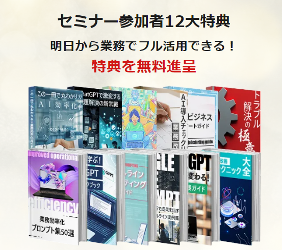 の無料オンラインセミナーに参加するだけで、「初心者が使うべきAIツール20選」や「AI副業案件集」、「ChatGPTの教科書」など、合計12種類の学習資料が全員に無料配布されます。