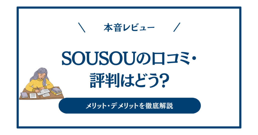 - 【本音レビュー】SOUSOUの口コミ・評判はどう?実際に使ってわかったメリット・デメリットを徹底解説ブログ記事を書かなきゃいけないのに、ネタ探しや構成づくりであっという間に時間が消えてしまうことってありませんか… 続きを読む: 【本音レビュー】SOUSOUの口コミ・評判はどう?実際に使ってわかったメリット・デメリットを徹底解説