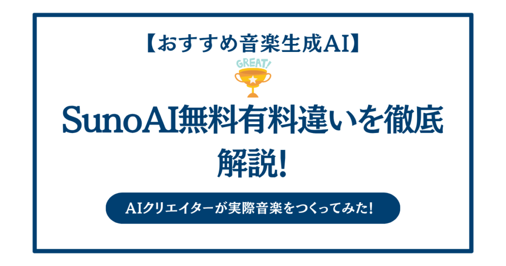 - SunoAI無料有料違いを徹底解説!初心者はどっちを選ぶべき?AIクリエイターが実際音楽をつくってみた!SunoAIの無料と有料の違いが分からず、どちらを選ぶべきか迷っていませんか。 実際、SunoAIは無料でも音… 続きを読む: SunoAI無料有料違いを徹底解説!初心者はどっちを選ぶべき?AIクリエイターが実際音楽をつくってみた!