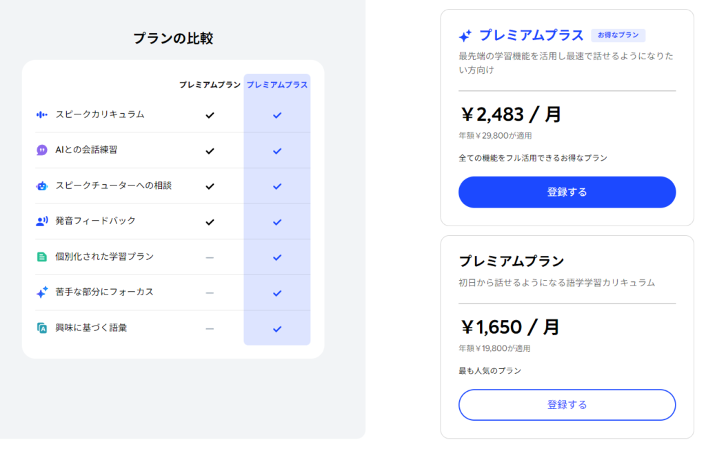 AI英会話スピークの料金プランは、「プレミアムプラン」と「プレミアムプラス」の2種類があります。