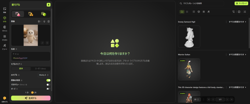 右側の『私の資産』エリアに生成済みのモデルが一覧で並んでいます。