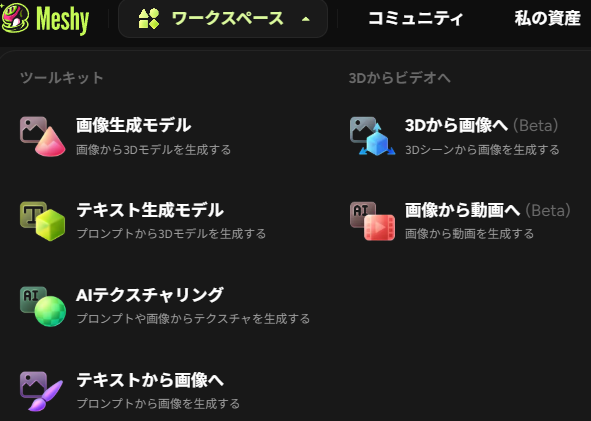 ここでは、MeshyAIでまず知っておきたい4つの機能を順番に見ていきます。