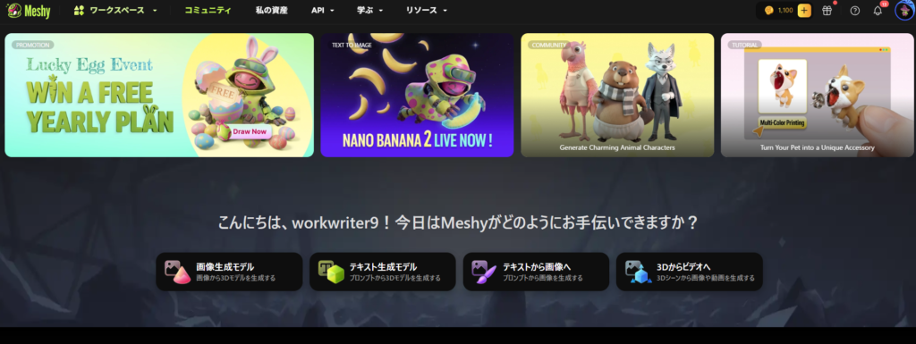 MeshyAIで画像から3Dモデルを作るときは、まずアカウント登録を済ませてワークスペースに入ります。