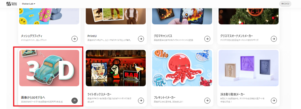 ログイン後のホーム画面では、3D関連の機能がいくつか並んでいますが、今回使うのは『画像生成モデル』です。