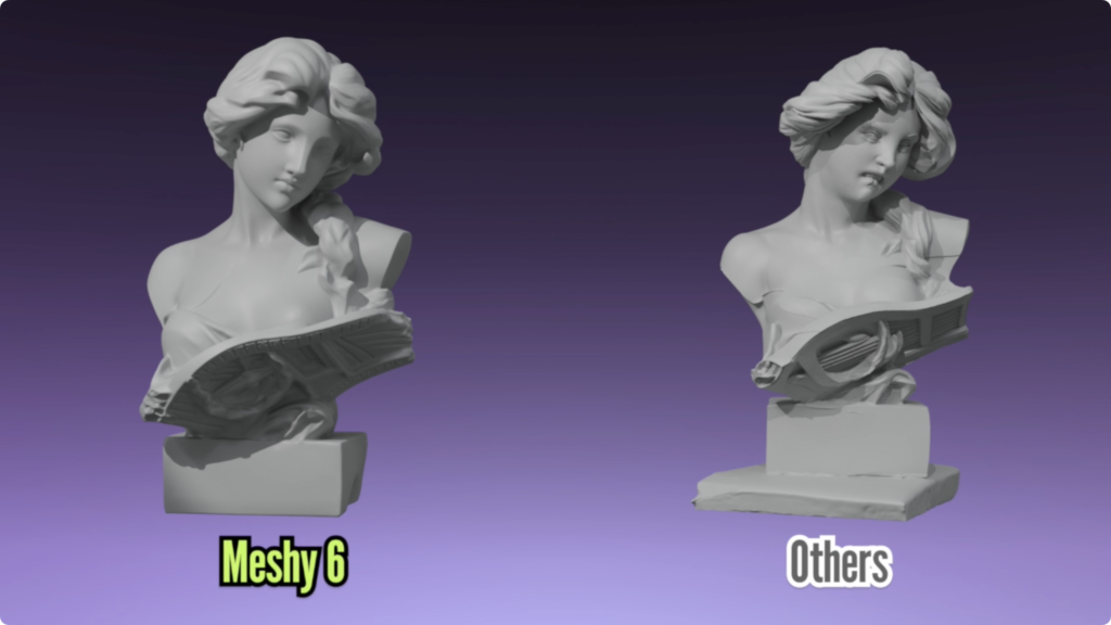 画像のようにMeshy6と他のモデルを並べて見ると、顔まわりや髪の流れ、服や土台の形まで、Meshy6のほうが整って見えやすいです。