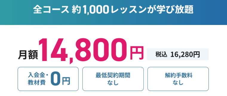 コース型は約19.8万円〜49.8万円、月額プランは約14,800円で学び放題があります。 :c
