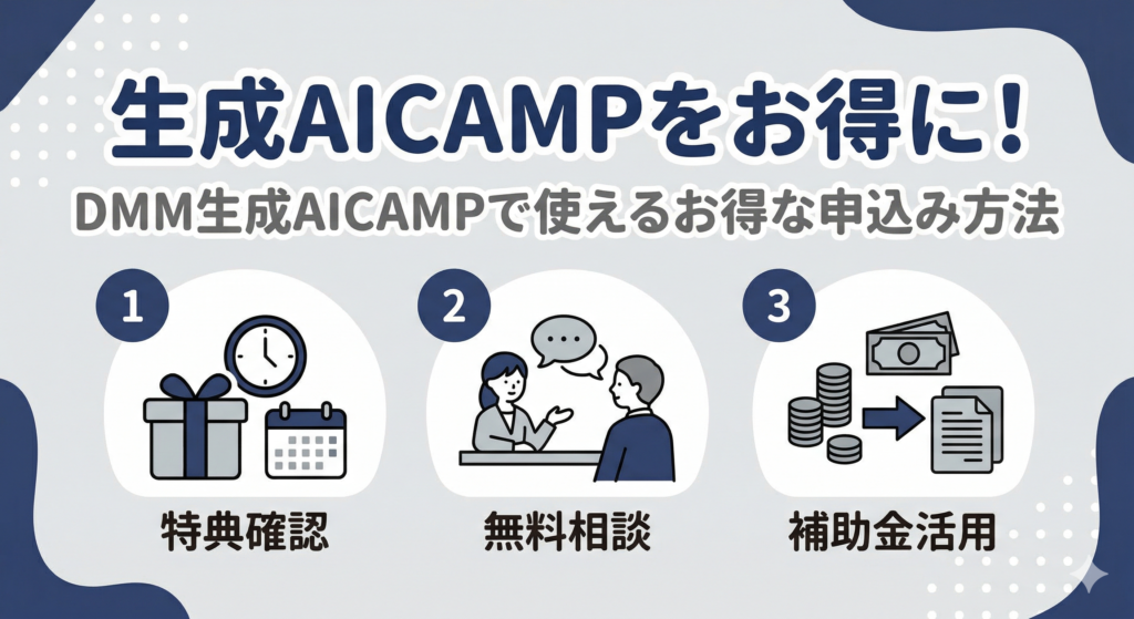 DMM生成AICAMPでは、無料相談や申込み特典が実質的な割引になることがあります。