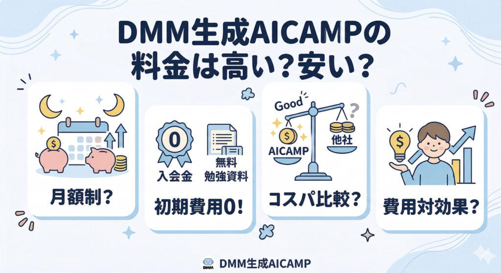 DMM生成AICAMPの料金は、結論から言うと安くはありませんが、内容を考えると十分に回収しやすい価格帯です。
