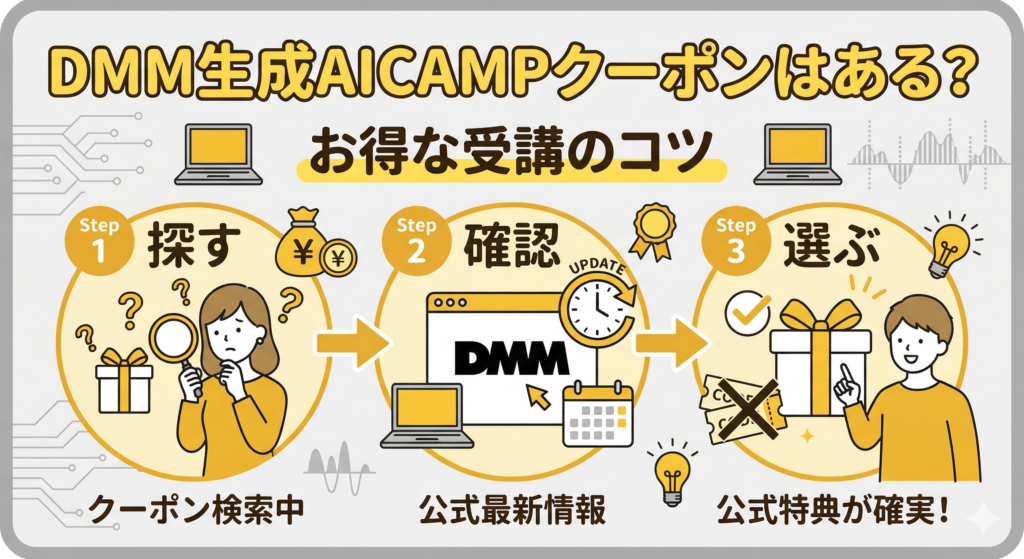 DMM生成AICAMPはクーポンコードを探すより、今使える公式特典を確認するほうが早くて確実です。