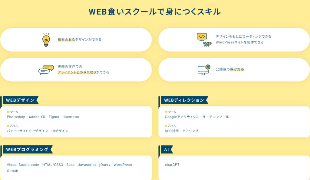 『WEB食いオンラインスクール』では、Web制作に必要なスキルを幅広く学ぶことができます。
