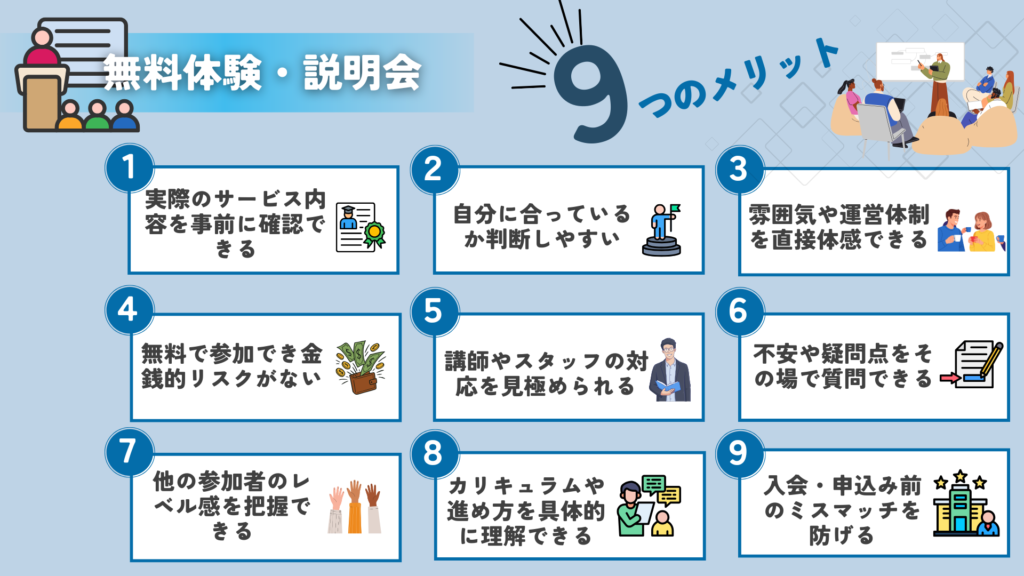 迷っているなら、いきなり入会で決めるより、まず無料体験や説明会で空気感を見てください。