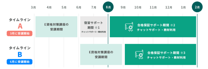 これらを満たした受講者には、受講開始日以降に実施される2回目のE資格試験まで無償でサポートを継続することが約束されます。