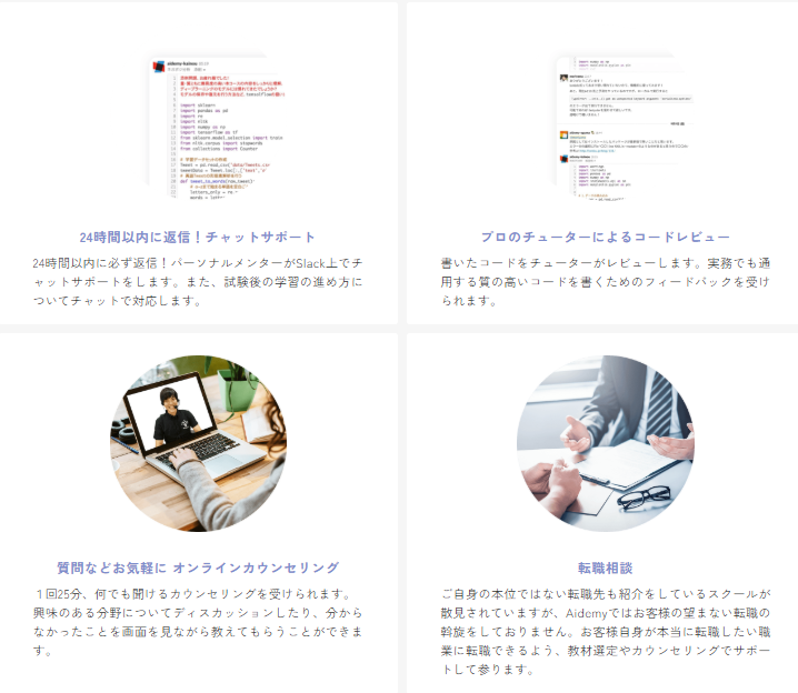 特にプログラミングを学んでいると、自分が書いたコードがうまく動かないと不安になってしまいます。そんなとき、すぐにサポートを受けられるのはとても心強いです。