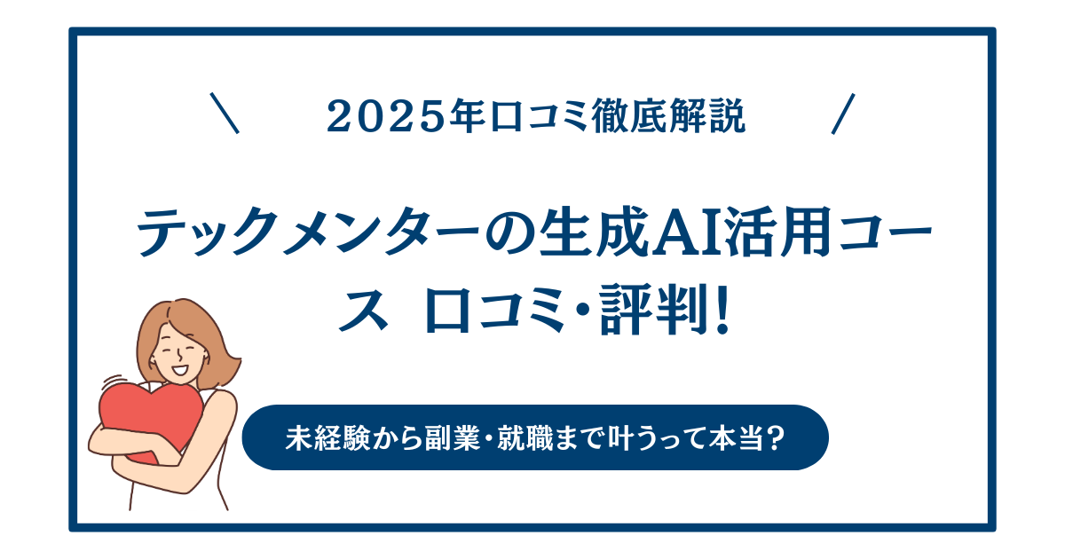 この記事では、Tech Mentor(テックメンター)の『生成AI活用コース』に特化して、実際の口コミや評判、カリキュラム内容、料金、サポート体制まで徹底的に解説します。