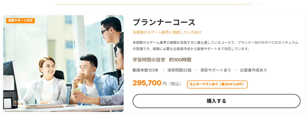 このプランでは、オンラインで自分のペースで学べるだけでなく、現役のゲームプランナーからの個別指導や、転職支援も受けられるので、学んだ知識を実際の業務にすぐ活かせる環境が整っています。