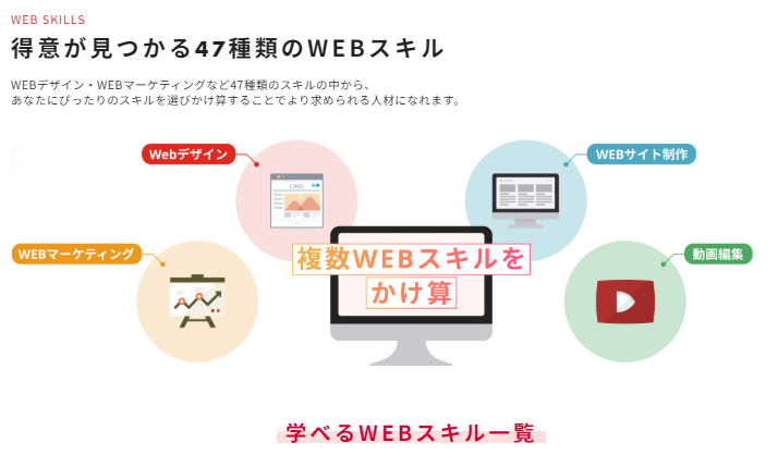 Webデザインやサイト制作、マーケ、動画編集などを含む「47種類のWEBスキル」が学べます。