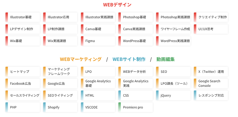 | 学べる内容 | 47種のWEBスキル(Webデザイン/Webサイト制作/Webマーケ/動画編集)+ビジネススキル(法務・税務/提案書/商談・営業/クラウドソーシング) | デザイン/動画編集/Webマーケ/ライティング/ビジネス基礎 など(コースカテゴリに網羅) |