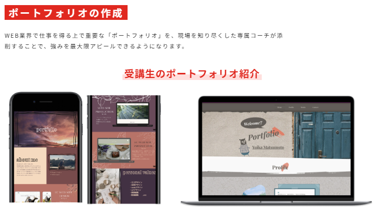 WEBCOACHは学習の進捗管理に加えて、制作物のレビュー、ポートフォリオ設計、案件獲得の練習や紹介の機会まで踏み込みやすいのが特徴です。