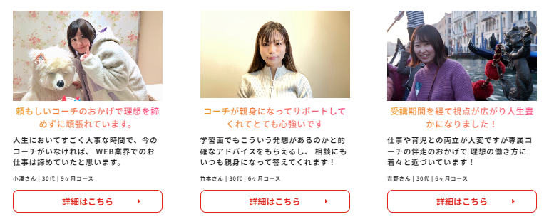 「WEBCOACHのおかげでWEBデザイナーに転身できました! コーチや、カスタマーサポートのヘルプが手厚いと感じました。また受講期間が終わっても、カリキュラムが閲覧できるのがいいと思っております。」