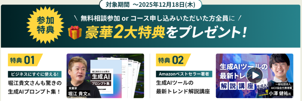 | 実施あり | オンライン | ・10大特典(ChatGPTプロンプト52選、AIキャリアロードマップなど) | |