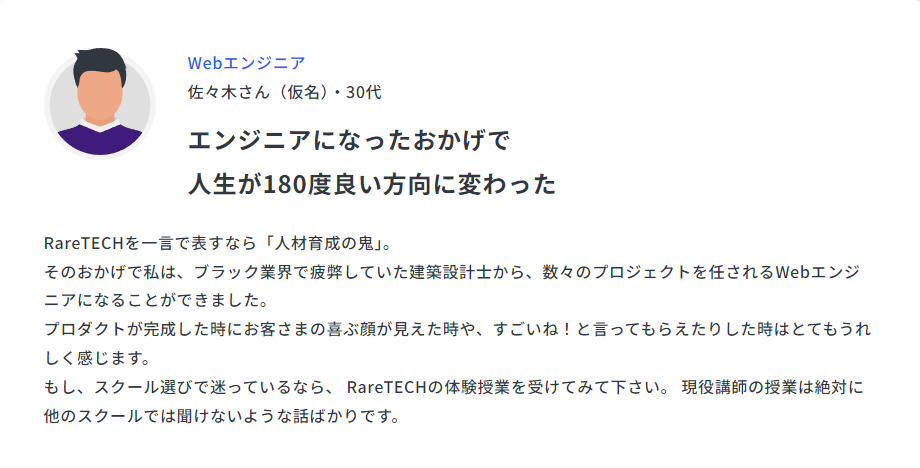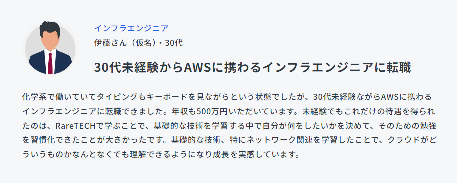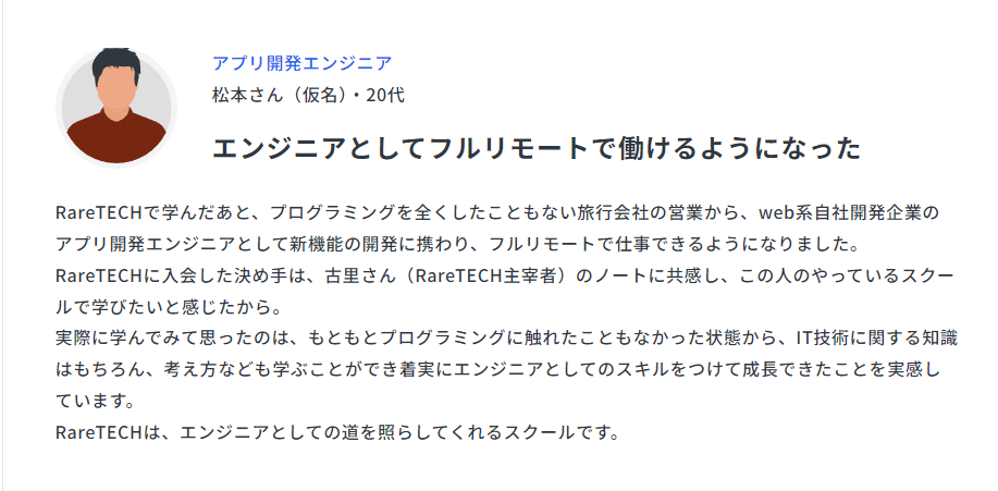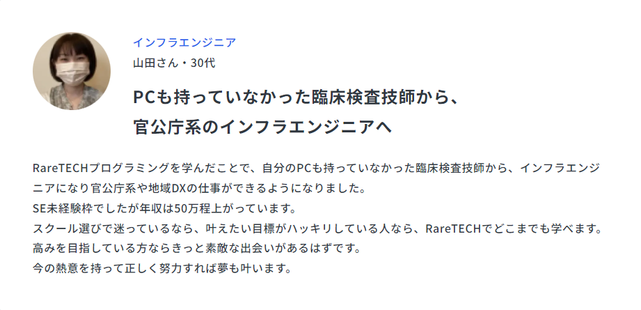 また、RareTECH(レアテック)の卒業生は、契約社員から正社員のバックエンドエンジニアへ昇格して年収を約80万円伸ばしたり、旅行会社の営業からアプリ開発エンジニアに転身してフルリモートで働けるようになったという実例もあります。