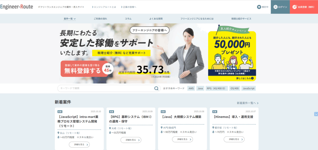![]() Engineer-Route | 経験者/フリーランス | Web/汎用機/インフラ | 約3,000件 | 無料 | 非公開 | 約1,000社 | 非公開案件多数、老舗エージェント |