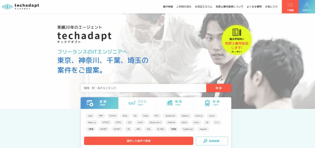![]() TechAdapt | 若手/経験者 | AI/DX/SaaS | 非公開 | 無料 | 非公開 | 非公開 | 生成AI・DX案件中心、最新スキル活用可 |