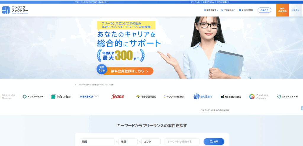 ![]() エンジニアファクトリー | フリーランス | Web/アプリ/開発 | 約4,000件 | 無料 | 非公開 | 約800社 | 案件紹介特化、支払い早い |