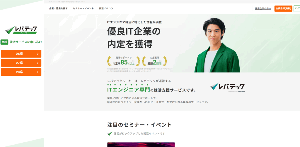 エンジニア就活 | 新卒/既卒 | IT/Web開発 | 非公開 | 無料 | 内定率非公開 | 非公開 | IT学生向け就職支援サイト |