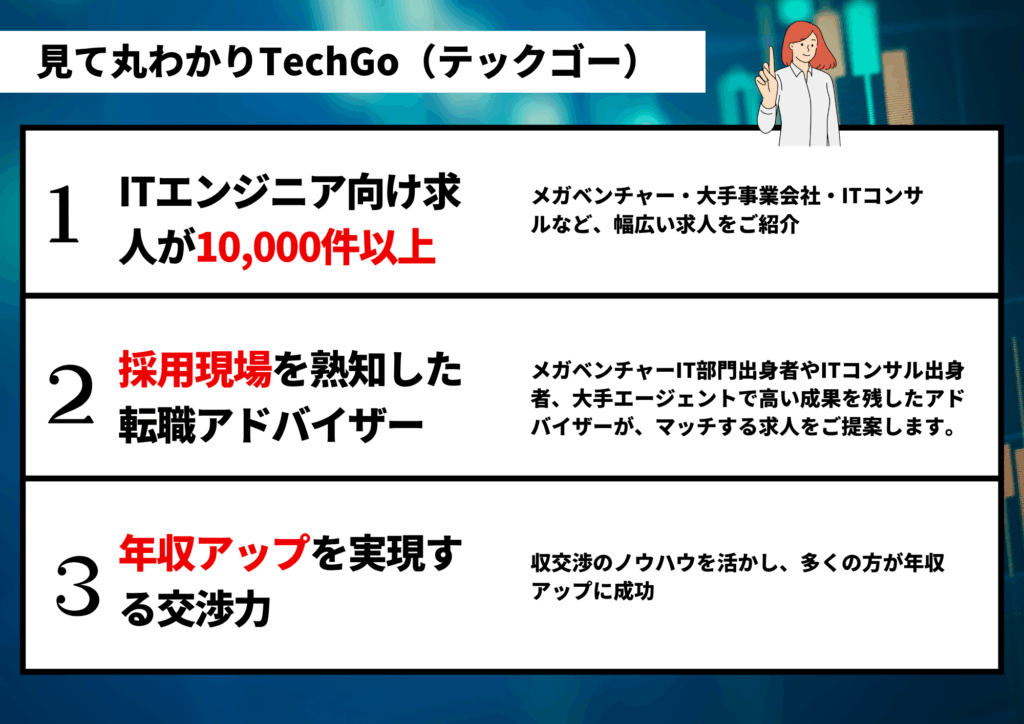 TechGo(テックゴー)は、ITエンジニア・ITコンサル職に特化した求人を多く扱っています。