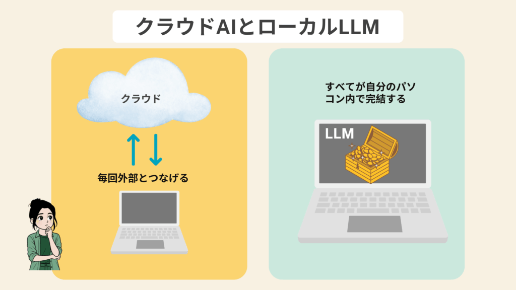 ざっくり言うと、クラウドAIはインターネット越しに借りて使うAIで、ローカルLLMはあなたのパソコンの中に直接入れて動かすAIのことです。