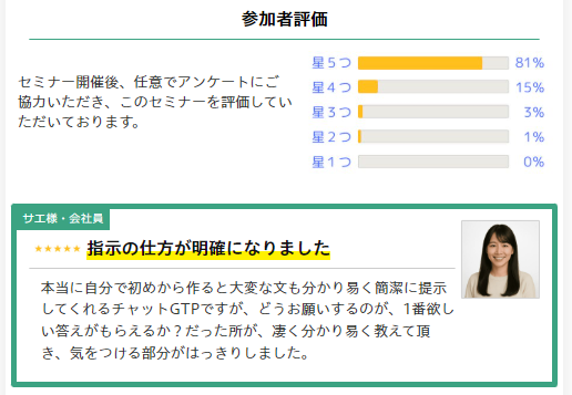 単に文章が生成できるのではなく「仕事の時間を短縮して、生み出した時間を価値ある作業に回す」ための使い方が身につく点が大きな魅力です。