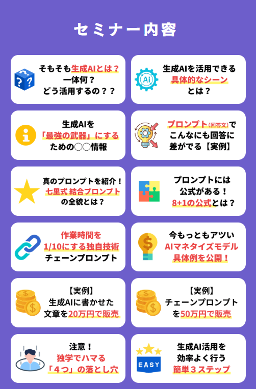 セミナーでは、生成AIで作った文章が20万円、チェーンプロンプトが50万円で販売された実例が公開されます。