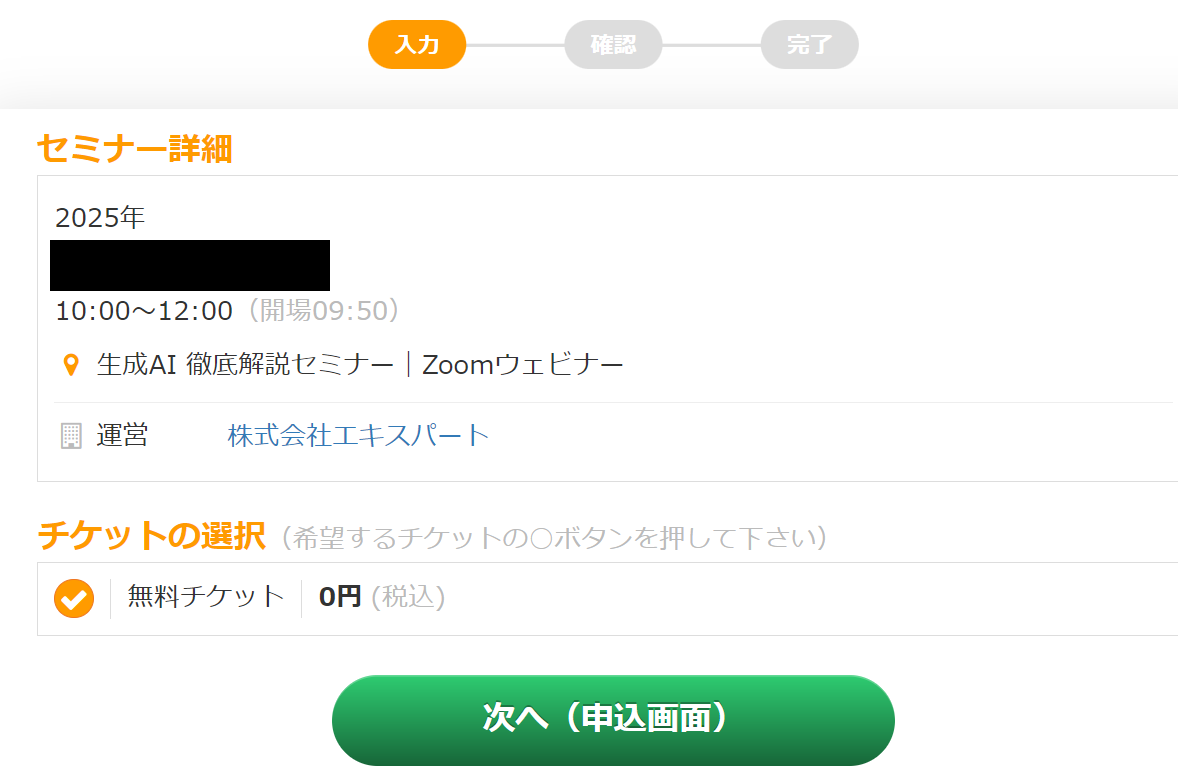あとは内容を確認して申し込みボタンを押せば、無料セミナーの予約完了です。