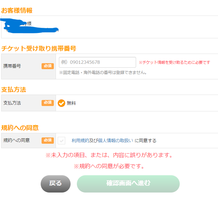 この画面では、最後の確認のために携帯番号と規約への同意を入力します。