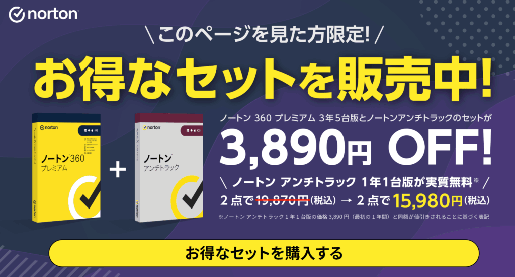 さ今なら、限定キャンペーンとして プライバシー保護機能「ノートン アンチトラック」 が実質無料で付いてくるお得なセットが販売されています。