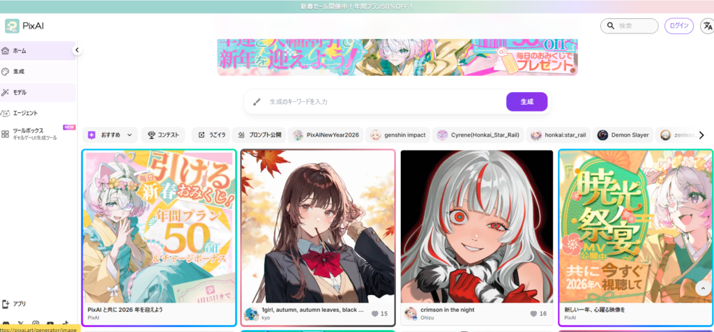 PixAIは、最初から二次元寄りの絵が出やすいアニメ系の画像生成サービスです。