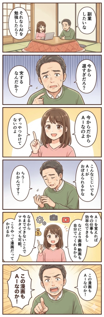 コマ4: 50代おじさん「こんなじじいでもAIがおぼえられるかな」