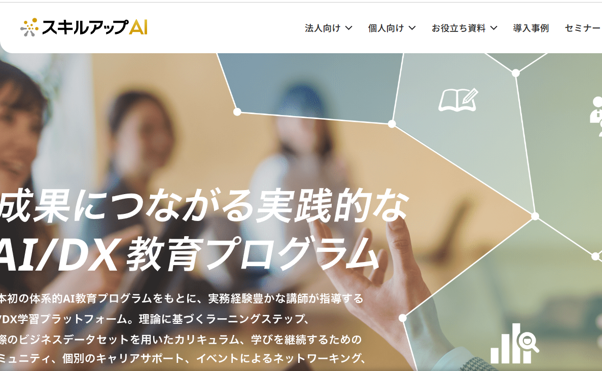 スキルアップAIは、現場で即戦力として活躍できる実践的なAIスキルを習得できるスクールです。