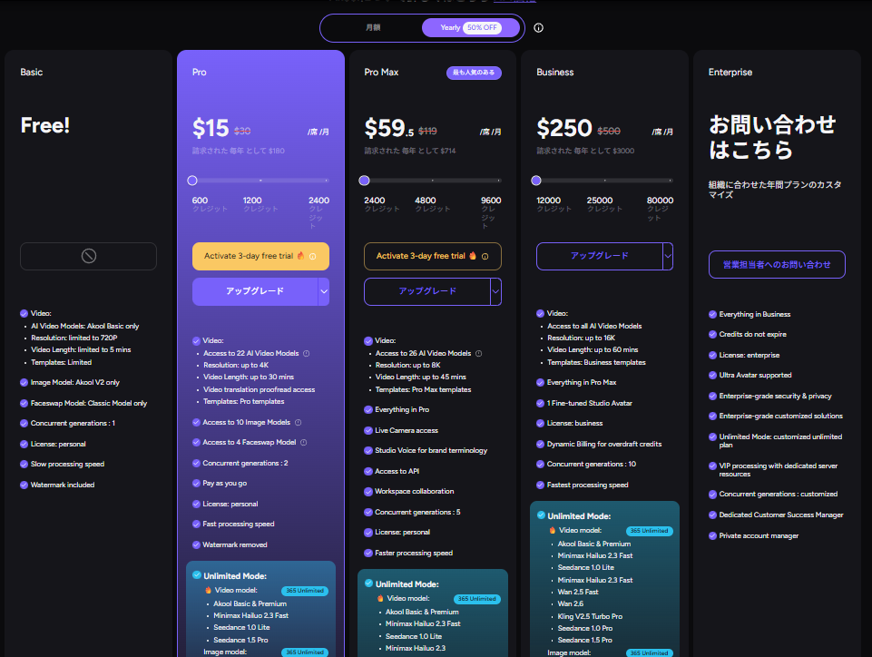 AKOOLの有料プランは、公式上はPro、Pro Max、Business、Enterpriseという並びで、上位になるほど解像度上限や同時生成数、テンプレや機能が増えます。