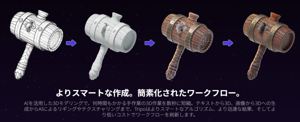 従来のBlenderやMayaといった3DCGソフトでは、モデリングやテクスチャリング、リギングなど専門的なスキルが必要でしたが、Tripo AI(トリポエーアイ)はこれらの工程をAIが自動化してくれます。