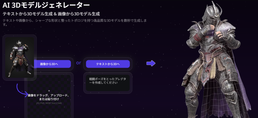 画像からの生成では、手持ちの写真やイラストをアップロードすると、その画像を元に立体的な3Dモデルを生成します。