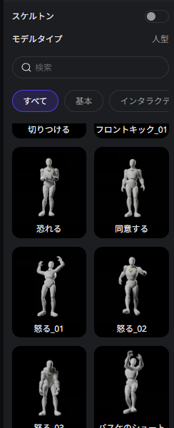 歩く、走る、ジャンプするなど、100種類以上の動きがあらかじめ用意されています。